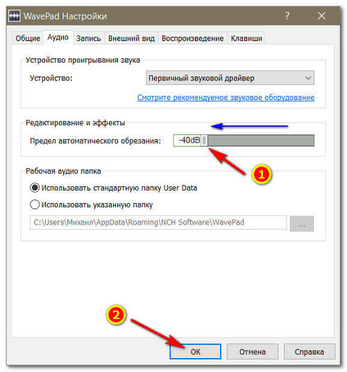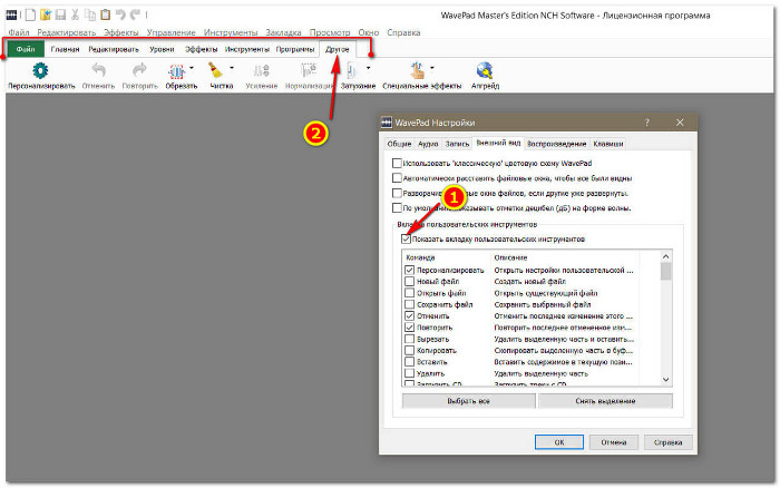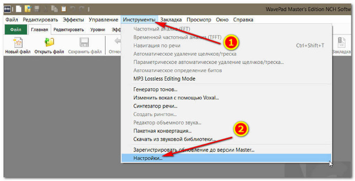 Нажмите «Скачать WavePad на русском языке» на компьютер. Воспользовавшись меню, расположенным по горизонтали, нужно нажать опцию «Инструменты» — первая стрелка. Выпадет контекстное меню, где находится пункт настроек, — вторая стрелка. После этого откроется окошко.