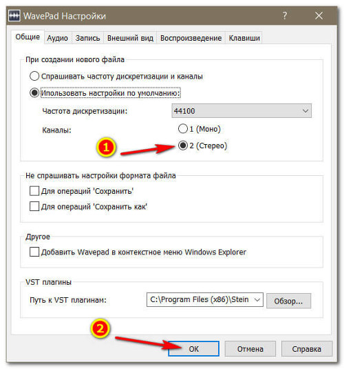 Пользователю надо найти вкладку «Общие» и активировать кнопку радио под названием «Стерео» (первая стрелка). Необходимое условие, которое должно быть соблюдено, — нужный формат стереозаписи файла, подлежащего редактированию.
