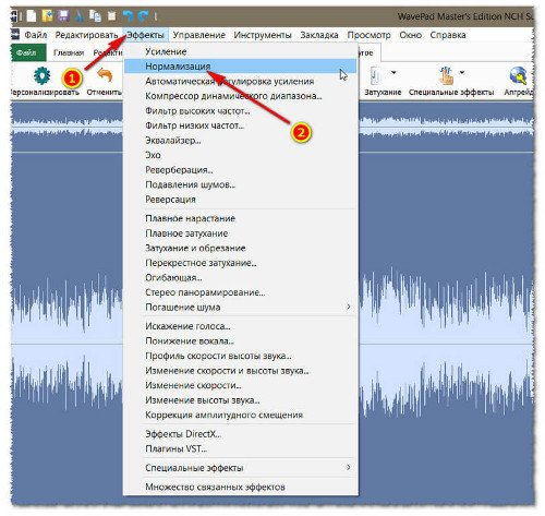 В программе можно действовать и без инструментальной панели, кликнув в меню «Эффекты», далее — «Нормализация». Волны модифицируются с помощью процентного изменения. Запись проигрывается по команде Play.